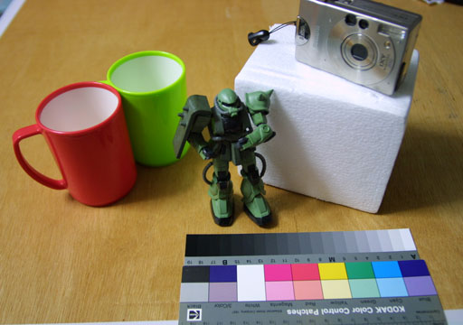ご覧の通り、ベニヤ板の上にプラスティックのカップとプラモデル、白い発泡スチロールの上には金属外装のコンパクトカメラ